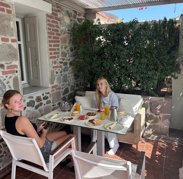 Na de training reden we naar de hoofdstad Mytilene. Daar vonden we een superleuk plekje onder de olijfbomen voor de lunch. Daarna liepen we nog wat door de smalle straatjes, deden boodschappen en keerden terug naar ons verblijf. Even bijkomen in de airco voordat de avondtraining begon.